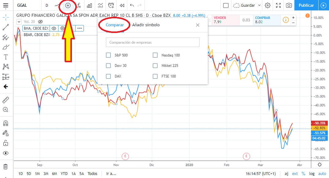 Hay otros que nos dan más precisión como el caso de tradingview, el cual recomiendo para un análisis detallado. A continuación la comparación entre los ADR de Grupo Financiero Galicia, Banco Macro y Banco Francés.